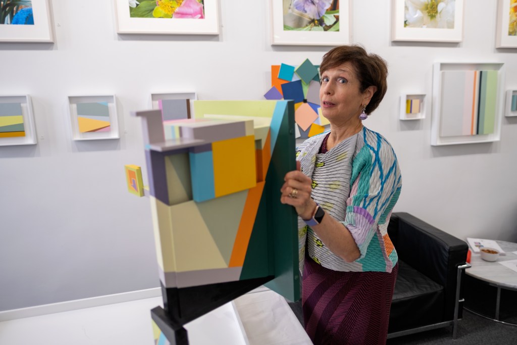 When I entered Galerie Mourlot on E. 79th Street two days ahead of Judith Seligson’s new solo exhibition, the more I looked around, the more I saw boxes everywhere, each containing either a painting, a pigment print, or a sculpture Seligson, a geometric abstract artist, created during the pandemic. On one wall, John—the installer—was carefully calculating the distance between two frames: on top, a series of photographs of flowers painted over—snapshots of nature blooming and blossoming despite the pandemic, aptly titled “Covid Spring”—and below a selection of bold striped paintings, or intervals paintings, as Seligson described them to me.
